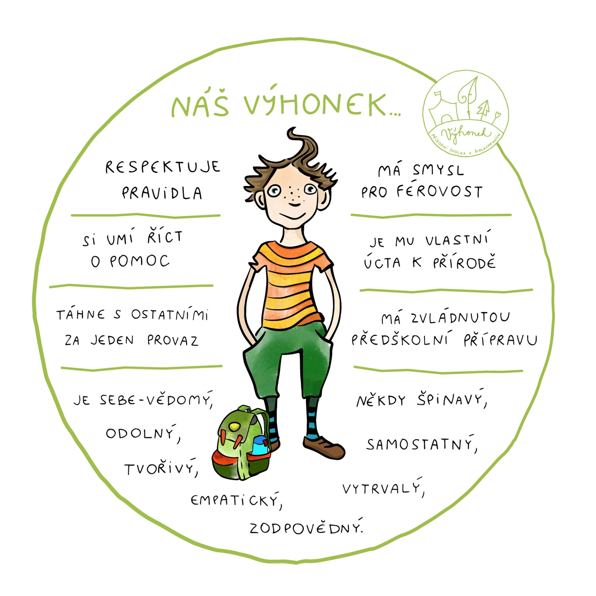 Průvodci v naší lesní školce ke každému dítěti přistupují s respektem k jeho osobnosti a jeho potřebám. Děti vedeme k samostatnosti a odpovědnosti za své chování. Klademe důraz na osobní svobodu dítěte a jeho volnost, avšak za dodržování pravidel, která si společně s dětmi nastavujeme na začátku školního roku. Pravidla jsou jasná a srozumitelná.